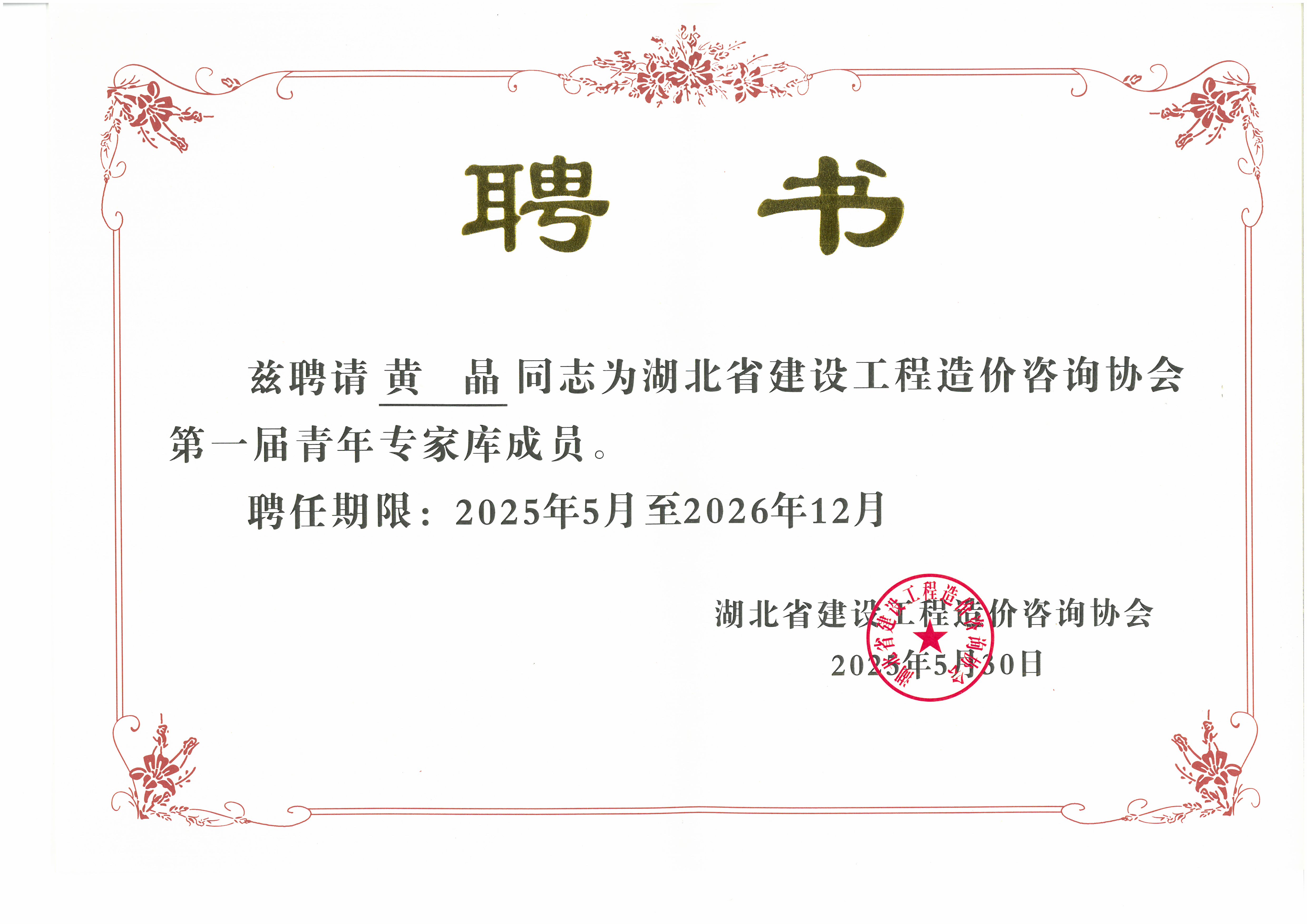 此次入選湖北省建設工程造價咨詢協(xié)會第一屆青年專家?guī)欤粌H是對黃晶個人專業(yè)能力的高度認可,更是對我司在工程造價領域專業(yè)水平的肯定。這既是一份榮譽,更是一份責任。